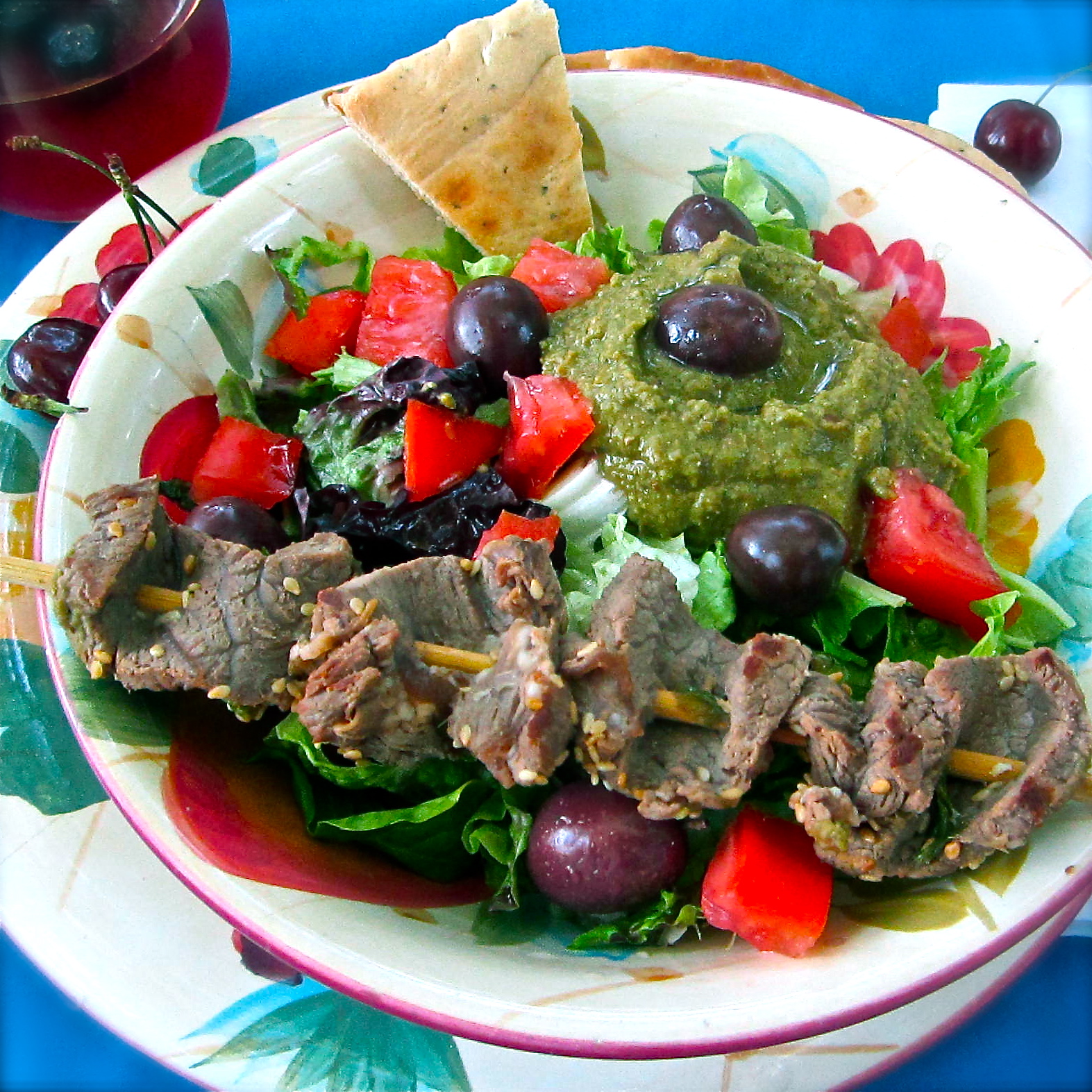 Close up the bag, pressing the air out, and marinate for 15 minutes. Thread the beef on skewers and grill them on the barbecue grill or on the stove in an iron skillet for 1 to 2 minutes each side, until they are as done as you like. Serve each salad with one or two skewers, for a very cool summer dish.